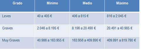 Las infracciones en materia de prevención de riesgos laborales se podrían sancionar como indica la siguiente tabla: