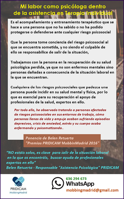 "Premios PRIDCAM MobbingMadrid" 2016"Ponencia de Belén Retuerta Directora del "Servicio de Asistencia Psicológica PRIDICAM, desde hace 4 años, ha atendido a más de 300 personas, dando servicio psicológico a más de 110 personas afectadas por riesgos psicosociales, tanto en terapia individual como grupal.