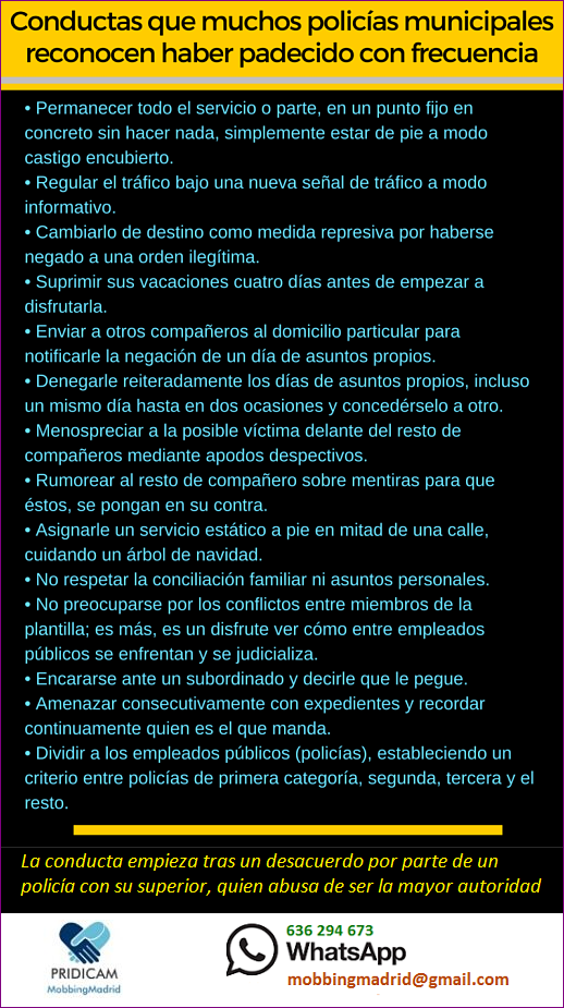 ü Permanecer todo el servicio o parte, en un punto fijo en concreto sin hacer nada, simplemente estar de pie a modo castigo encubierto.ü Regular el tráfico bajo una nueva señal de tráfico a modo informativo.ü Cambiarlo de destino como medida represiva por haberse negado a una orden ilegítima.ü Suprimir sus vacaciones cuatro días antes de empezar a disfrutarla.ü Enviar a otros compañeros al domicilio particular para notificarle la negación de un día de asuntos propios.ü Denegarle reiteradamente los días de asuntos propios, incluso un mismo día hasta en dos ocasiones y concedérselo a otro.ü Menospreciar a la posible víctima delante del resto de compañeros mediante apodos despectivos.ü Rumorear al resto de compañero sobre mentiras para que éstos, se pongan en su contra.ü Asignarle un servicio estático a pie en mitad de una calle, cuidando un árbol de navidad.ü No respetar la conciliación familiar ni asuntos personales.ü No preocuparse por los conflictos entre miembros de la plantilla; es más, es un disfrute ver cómo entre empleados públicos se enfrentan y se judicializa.ü Encararse ante un subordinado y decirle que le pegue.ü Amenazar consecutivamente con expedientes y recordar continuamente quien es el que manda.ü Dividir a los empleados públicos (policías), estableciendo un criterio entre policías de primera categoría, segunda, tercera y el resto.